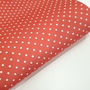 Umetno usnje s potiskom velikosti 20 x 30 cm. Velikost motiva je primerna za izdelavo okrasnih pentelj za lase in drugih manjših modnih dodatkov. Premer ene pikice je približno 5 mm.